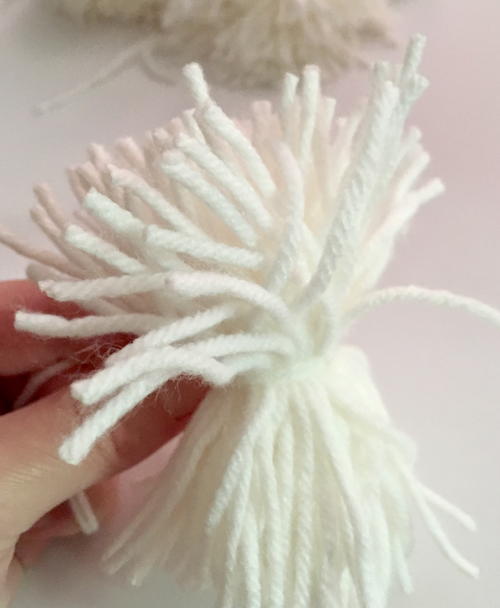 Now you can slide the pom pom off of the cardboard maker! Do this slowly, and then give it a good shake to fluff the yarn again. Trim off a bit from any very long pieces so the pom is more even and round.