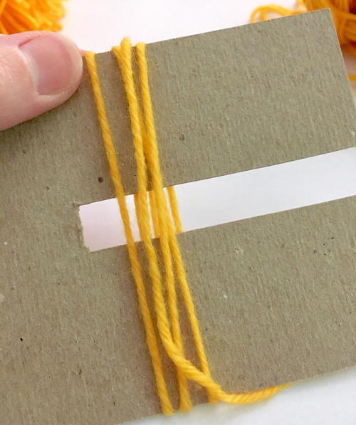 Take one of your 17-18” long pieces in the corresponding color and slide it through the small open space within the cardboard maker. Then take the other end and tie it tightly in the center in a double knot. Do this without breaking the yarn (this means you are pulling too tightly). Flip the cardboard and yarn over and make another double knot, being sure that it’s very secure.