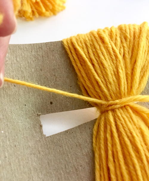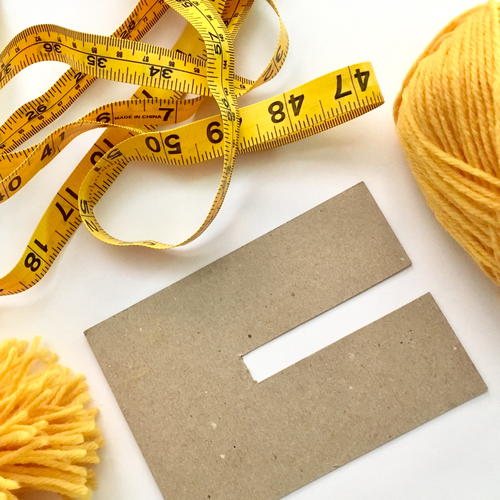 Now you’ll need to create a pom pom maker tool (see photo). The cardboard piece I used is about 3.5” by 5” with a long rectangle cut out of the middle. It’s best to use a sturdy cardboard so it will keep its shape, especially since you’ll be making so many poms for this project. My finished pom poms were also about 3.5” across using this cardboard maker.