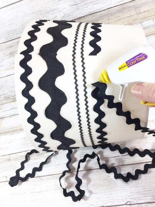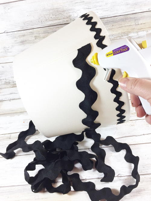 Starting at the lampshade seam, apply 5/8” Medium Ric-Rac to the circumference with hot glue. Take your time and apply small amounts of hot glue, so the finished product looks neat and the glue does not show. Trim end of Ric-Rac with scissors and then seal edges with hot glue, to prevent fraying.