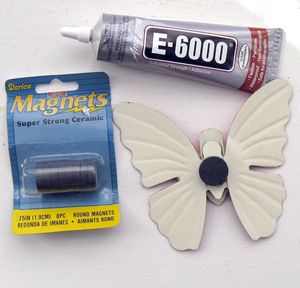 - Re-attach the body to the wings, then flip over and glue a magnet to the underside. A small glob of E-6000 will create a strong bond. Leave the butterflies to dry overnight.