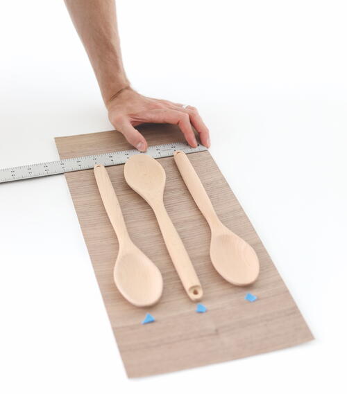 Arrange the wooden spoons according to your desired spacing and orientation on the backing. Using the ruler, mark the center of each point with a small piece of removable tape. (Tip: If your spoons aren’t relatively flat—you will want a ½- to 1-inch [13-mm to 2.5-cm] flat surface for the glue to bond—use a belt sander or orbital sander to flatten a section of the spoons’ backs to provide a surface that can adhere evenly to the backing.)