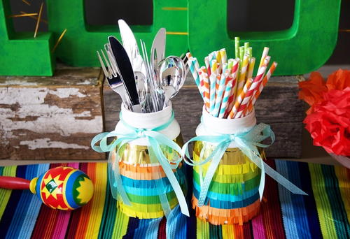 Mason jars: Prep mason jars by spraying with spray paint. Adhere paper fringe and ribbon. Insert straws and utensils.