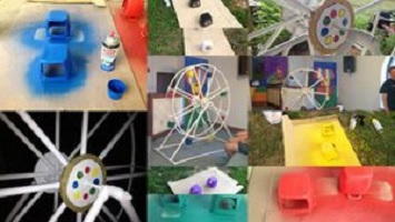 If you aren't sure what to do with that extra PVC pipe, consider creating a whimsical creative project like this one. Kids and adults alike will love the look of this Crazy Colorful Ferris Wheel - make one for your next party or place it in a living room. The eye-popping color and unexpected materials make this project a real gem. Dip into your stash of nuts and bolts to put the piece together - it takes less time to complete then you might imagine. Add little plastic baskets to your ferris wheel for a true-to-life feel and delightful personal touch. Our church Vacation Bible School theme was amusement-park inspired, so we needed a ferris wheel for decoration. From plywood, the circle was made to use to shape the PVC pipe which was a bit difficult to bend, even with the heat gun. Too much pressure, and it bends leaving a fold; too little pressure and it doesn't curve. Use patience. Plywood, PVC joints and pipes, threaded rods, washers and bolts, cheap plastic baskets, and Krylon Fusion spray paint add up to one ferris wheel to complete the set for Vacation Bible School.