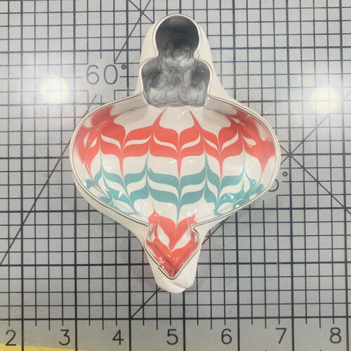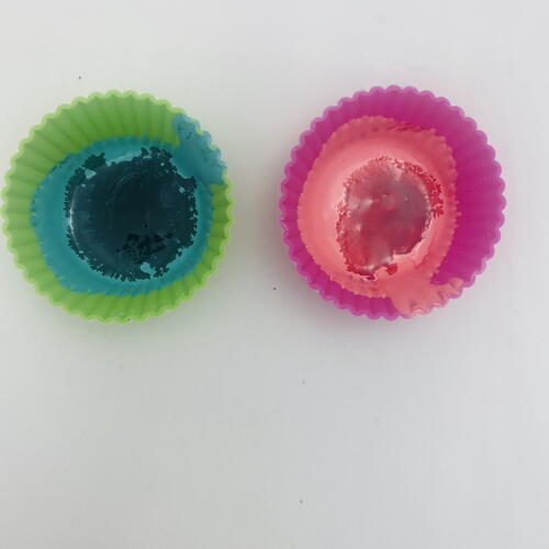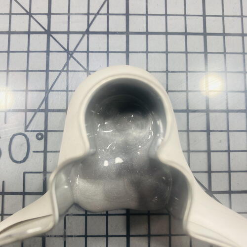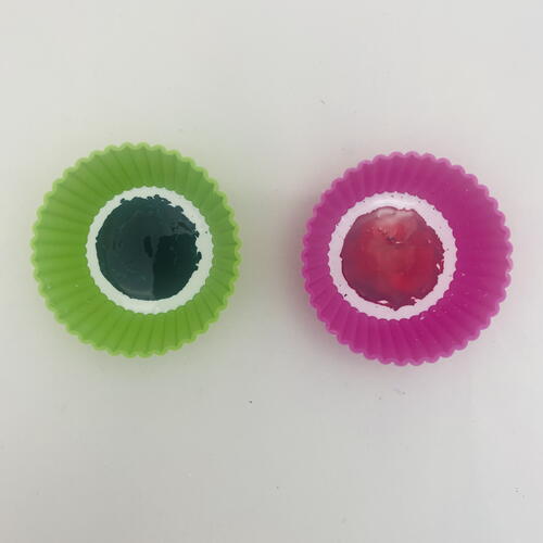While the ornament is in the oven you can work on tinting White LS to red and green. In two small silicone baking cups, squirt White LS in the bottom. In one of the cups add 2-3 drops of green alcohol ink. In the other cup add 2-3 drops of red alcohol ink.
