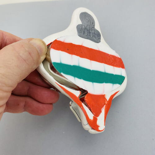 Squirt Silver Liquid Sculpey® (LS) into just the area that represents the hanger. Bake to set the Silver LS in place so that it does not get mixed in with the more colorful LS.