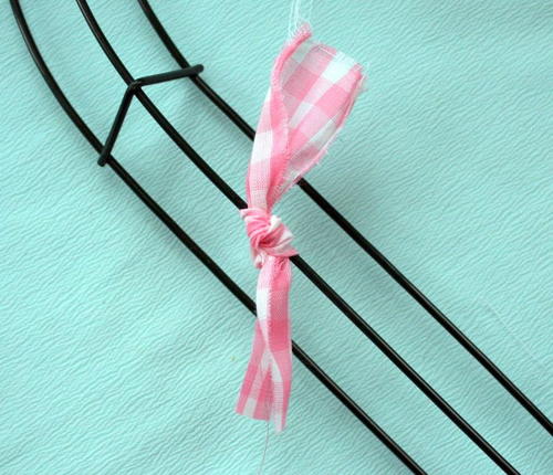Begin tying strips to wire form. Â A full knot isn't necessary.