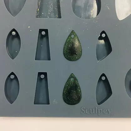 In the bottom of the teardrop shape in the Jewelry Mold, drop three separate drops of Emerald Metallic Liquid Sculpey® (LS).