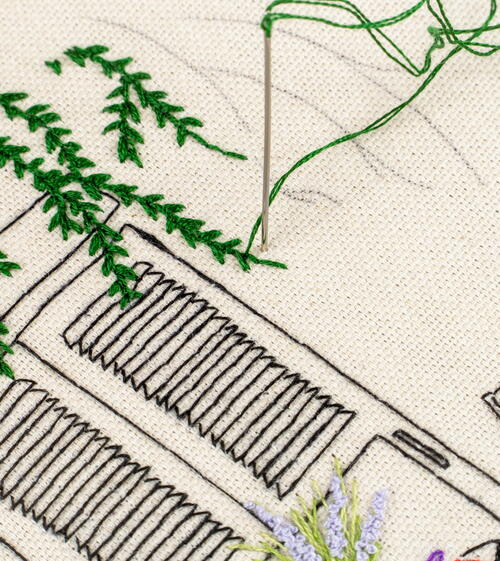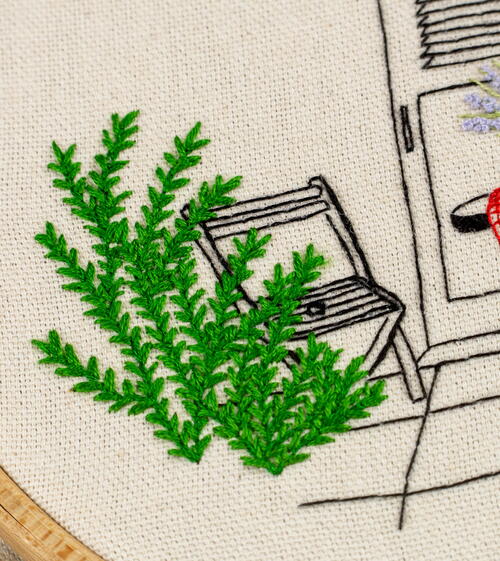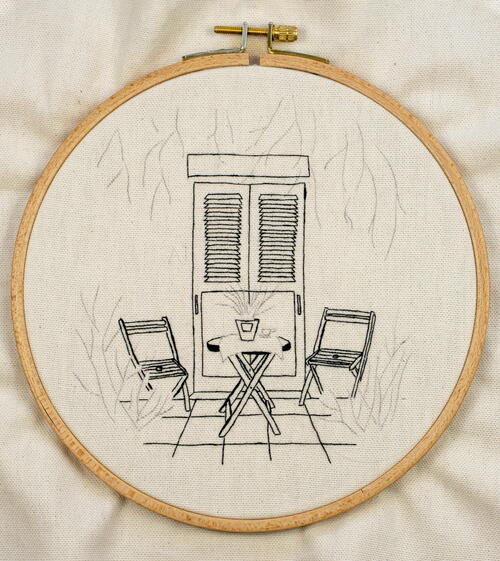 By stitching the terrace first, you naturally create more space in the design, as it will be easier to add the greenery and flowers on top of the black lines indicated in the background (the door), midground (the chairs and table) and foreground (the greenery). -