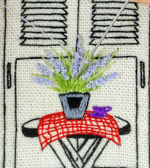 - Last, embroider the florals in the pot. Start by making single-stranded backstitched lines to symbolize the stem and leaves. Thereafter, add single-stranded mini French knots in vertical rows around approximately every other stem to get the lavender vibe. You don’t have to think about leaving space for the flowers, but rather feel free to embroider the knots on top of the backstitched lines. As you have used only a single strand, it will still be easy to push through the fabric without too much resistance or thread in the way.
