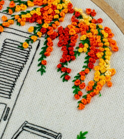For the florals, we recommend that you keep the full thickness of six strands on your thread. We mostly embroider architectural scenes with fewer strands, but these impressive and large flowers need some volume!