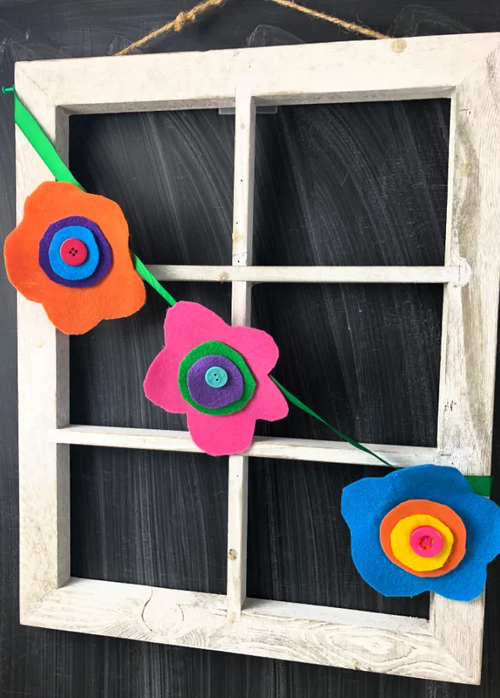 "I love this easy felt flower garland project for so many reasons. First of all, it is super cute. Second…it used felt scraps and I have so many of them in all the sizes and colors. It is easy peasy to make and can be done with a sewing machine, hand sewn or glued. This makes it a project that would work great with kiddos too. Once complete, it is adorable home decor or fabulous for a party too."
