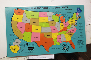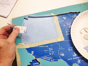 - I painted the outer surface of my map puzzle with cream-colored paint. I then sponged on some white lightly over the top of the cream to give it a distressed look.