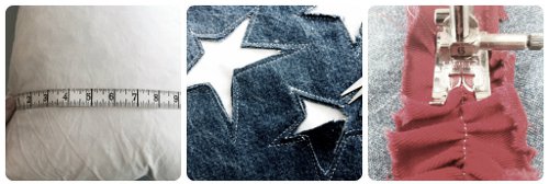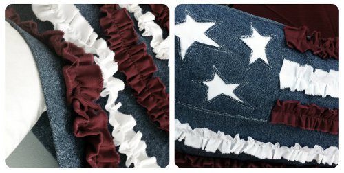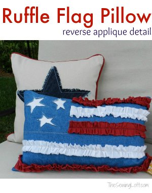 Show off your American pride with this Folk Art America Pillow. These patriotic throw pillows are a fun and festive way to get your home ready for July 4th...and you'll love how fun and easy these pillows are to make. Embellished with lovely ruffles and stars, these American flag throw pillows could easily be completed over the course of a weekend...and they're the perfect way for using up any leftover fabric or denim scraps that you have taking up room in your stash.