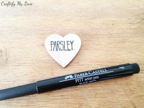 Now you'll be labeling the hearts with an artist pen (I used one from Faber Castell in size F). The guiding lines you drew in step 2 will help you write the herb name evenly.