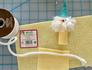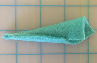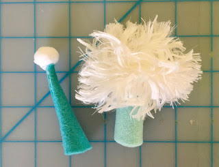 To make a long, skinny hat, roll a 3" wide strip of felt into a cone shape. Glue then trim into shape. Secure to the head with 1 or 2 small pins, or glue. Glue a white pom pom to the tip of the hat.