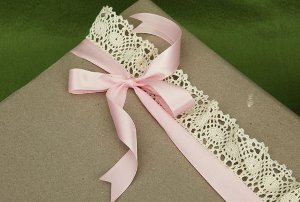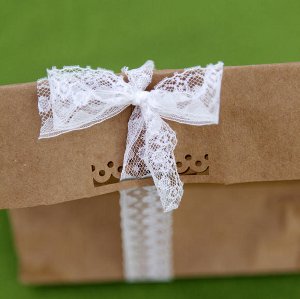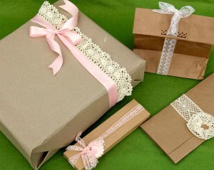 - Ruffle a long length of lace and wrap it around your brown paper wrapped gift. Add a bow or tag if desired.