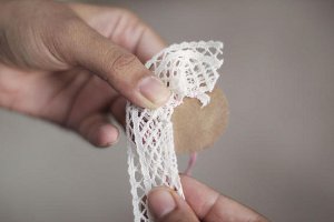 - To make flower, punch out a circle from Kraft circle. Fold lace in half width-wise, and stitch around the circle.
