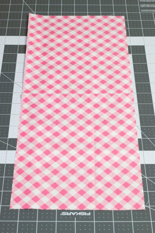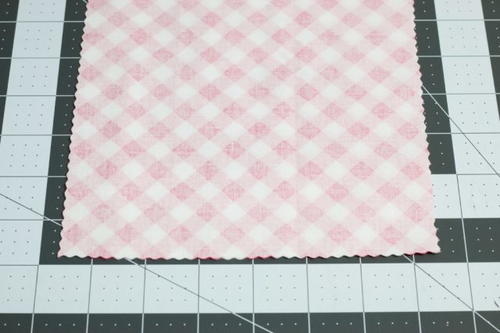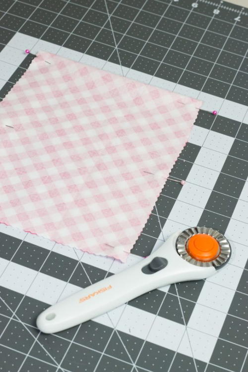 Using a rotary cutter and pinking blade, or pinking shears, to cut 6” x 18” rectangle from gingham fabric.
