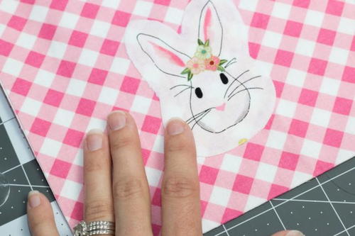 Fold the gingham rectangle in half, wrong sides together, and place the applique face-up on the top of the bag, 1” from the folded edge. Carefully press down on all sides of the applique to ensure it’s securely attached; let it dry flat for a few minutes.