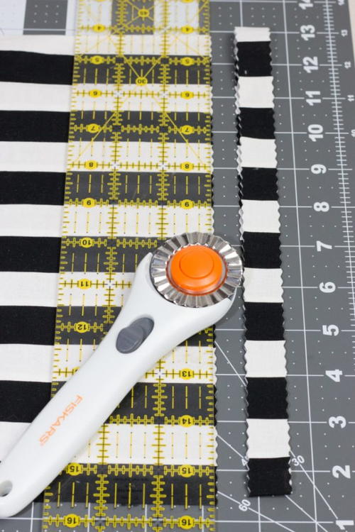 Using a rotary cutter and pinking blade, or pinking shears, cut a ¾” x 20” strip from the striped fabric for the tie.
