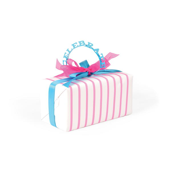 Bend the strip so the word Celebrate nicely arches over the gift. Wrap ribbon around box and tie in a bow.