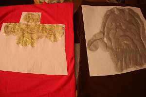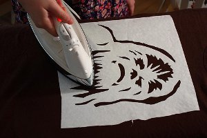- Once your stencil is made, iron it onto your T-shirt. The good thing about using freezer paper for stencils is that it will stay in place when you iron it (shiny side down!) but it's easy to peel off when you're done. Make sure you iron down all the corners and tiny strips that make up the details of the image.