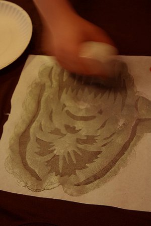- After you iron the stencil, use your fabric paint to apply paint to the negative space in the stencil. Wait about an hour between coats of paint (or follow the directions on your paint bottle), and let dry over night.