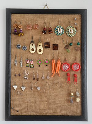 Stretch the mesh over an old frame, staple it in place, and hang earrings from it for a stylish earring organizer similar to this one.