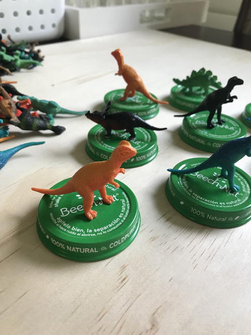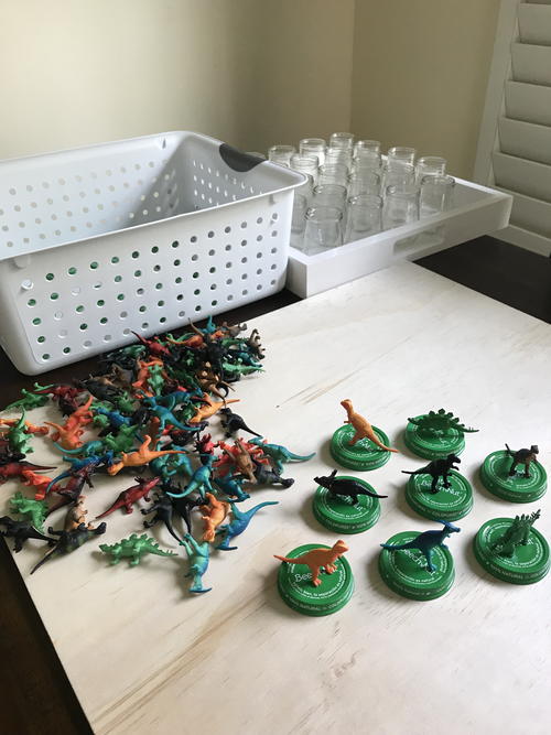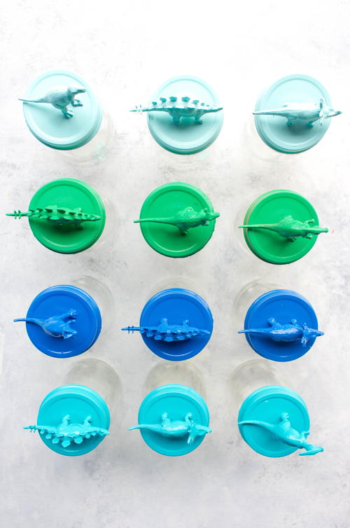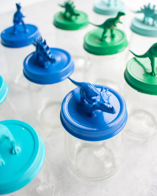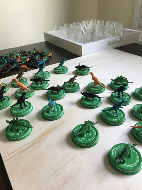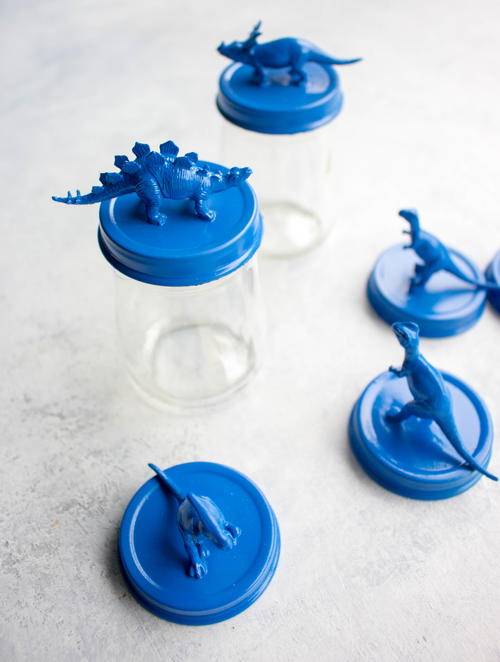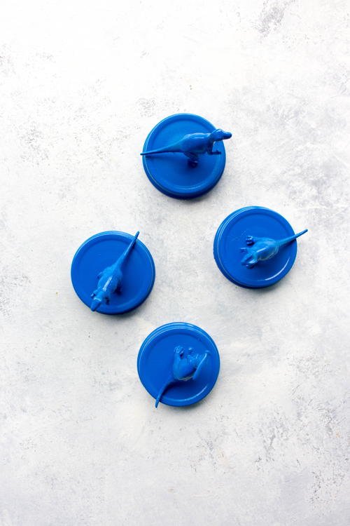 Using a hot glue gun or super glue, glue a small dinosaur to the top of a lid. Allow to dry.