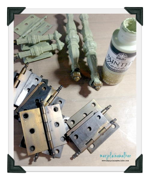 Paint the hardware with two coats of Plaid Folk Art Painted Finishes Moss, allowing it to dry between coats. Sand the hardware in some areas to distress it.