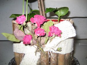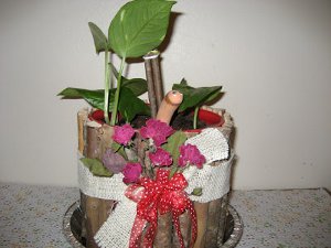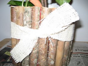 when my giant sycamore trees shed their bark I collect big sheets of it and while it is still pliable I bend it around cans, bottles, pots, etc. tie a string around it and when it dries it will hold it's shape. A coat or 2 of spray gloss makes it really shine and brings out the natural colors of the bark