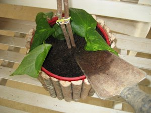 - Fill the container with potting soil as you arrange the plant (Peace Lilly) on it. You can choose the kind of plant you like to put in the pot. In this case, I need to make a stand because this plant grows in a vine. Attach 2 dried, long branches together with a plastic tie. Stick it on the center of the pot. If possible, add more soil and then press the soil down to make the dried stick stand.