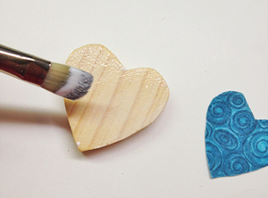 - Apply a layer of decoupage medium to the wooden heart and press the fabric heart onto it. Press out any air bubbles and let it sit for about 15-20 minutes. Apply a coat of decoupage medium over the entire heart, top and sides.