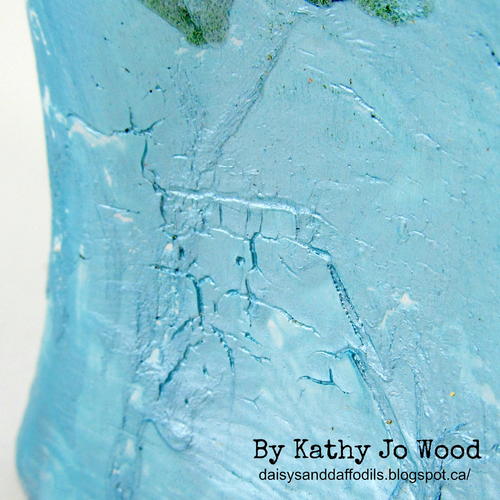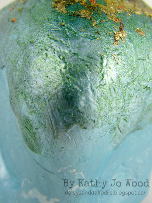 From the Designer: "A fun mixed media, upcycle project using various product from Plaid Enterprises. This project is the perfect way to upcycle a beautiful bottle into a happy home decor piece! Plaid products included Crackle Medium, Metallic acrylic paint and Extreme Glitter paint. Love the crackled metallic surfaces and the glitter gathered in the cracks. The details, shimmer and colors result in a project that you will happily display for yourself and others to enjoy. Warning: Once you upcycle one bottle, you can't help but look for more bottles to upcycle!"