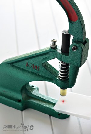 - Using a sewing stiletto or a metal skewer, pierce a small hole in the plastic near the bottom edge of the top flap and position the snap in the hole. Use a snap setting tool or snap press to fix the snap to the lid following manufacturers instructions. Place the corresponding snap on the inside flap and fix in place.