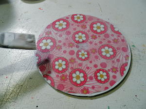 To the top of the CD add a coat of Mod Podge. Gently press the fabric circle onto the coated CD and press out any wrinkles or creases. Allow to dry for 20 minutes before continuing.