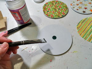 Apply two coats of Mod Podge to the top of the CD over the fabric, allow 2 hours dry time in between coats.