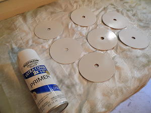 Spray 2 coats of primer onto the CDs, allowing for proper dry time in between coats.