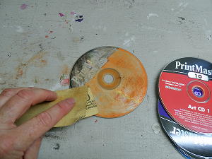 Lightly sand off the side of the CD that has a design or writing on it. You don't have to sand everything off, just take the gloss coat off.