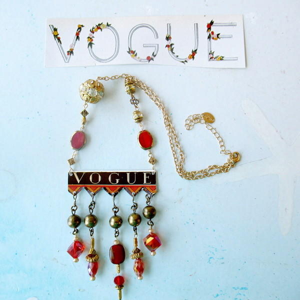 "I purchased a vintage coffee table book of Vogue Magazine covers from the early 1900's. The art is so vibrant and inspiring! The top portion of this magazine cover art for a Christmas issue caught my eye. I liked the zigzag of the valance and thought it would be fun to try to turn it into the feature for a necklace. I am so happy it turned out. It is OOAK but also a fresh new look from art that is over 100 years old!"