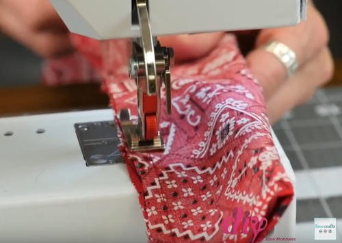 Next, with the right sides of the fabric together, sew the long side of the fabric and turn it right side out.Â