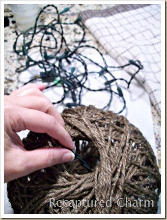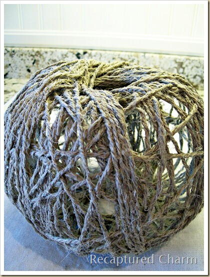 This is such a pretty project. When I first saw it I thought it was made from twigs, but it is twine and glue. I have made lamp shades for hanging lamps with yarn this way. It is incredibly messy, but if done right it is so nice. I love the lights inside. Such a nice touch.