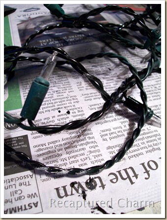 For the lights, you can certainly use a small string of twinkle lights the way they are. However, if you find them a bit too green, feel free to take some black spray paint and spray the cord— just be careful not to spray the lights.
