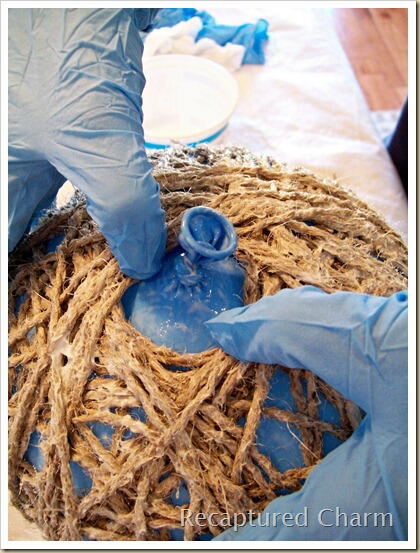 Leave a hole at the top and at the bottom of your balloon. Just get your fingers in there and pry the wet twine apart into a nice neat hole at both ends. The top hole doesn’t need to be too big, just big enough to insert a stick or stem. The bottom hole should be slightly bigger — big enough to place your pumpkin over a battery operated tea light or to insert your twinkle lights.