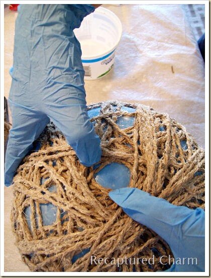 Run your glue covered hands over all the twine, then place the piece back on your container and allow to dry.Â