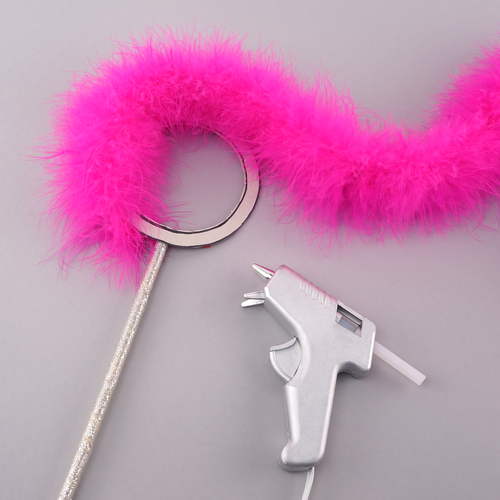 Glue the feather boa onto the cardboard ring using plenty of hot glue. Flip the wand over and glue more boa to the back of the circle.