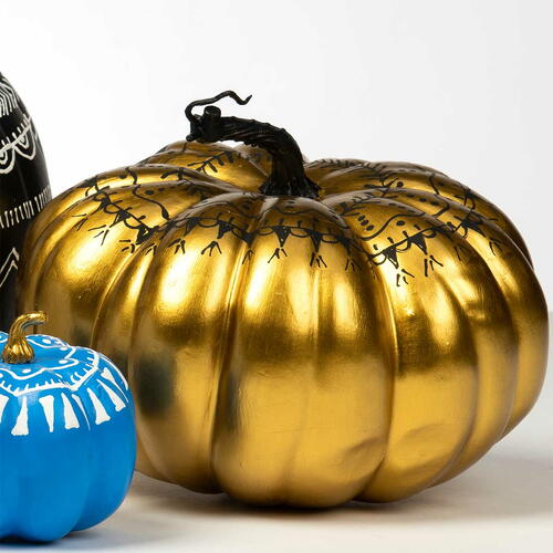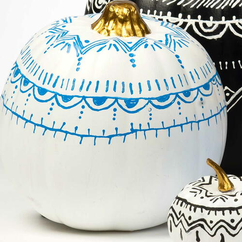Tip: Using chalk, very lightly make bands around the pumpkin for spacing. Use these chalk bands as a guide to place your doodle pattern so that it stays straight around the pumpkins. -