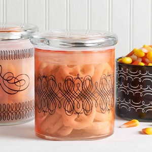 Oh, what to do with all of your Halloween treats! These Spooky Glass Treat Jars are cool Halloween decorating ideas to store all your yummy goodies. These glass jars look beautiful on a countertop, especially one that's covered in cobwebs for a party. Fill your Spooky Glass Treat Jars with bright candy corns, chocolate covered pretzels, or whatever your sweet tooth desires. This year, try some new Halloween decoration ideas for your home sweet haunted house.