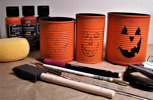 From the Designer: "Use recylced tin cans to make adorable treat holders for your Halloween party! You don't need to be a great painter to make these fun favors. This project uses just three colors of multi-surface paints which require no primer or sealer. You may already have the paint brushes, tools, and wire on hand. This project would make a great mom and me paint night! Use the patterns supplied to make the faces or free-hand your own jack-o-lantern faces!"